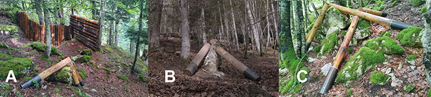 Photos of some of the NBS implemented in Artouste. A) Wooden barrier (passive measure) installed close to a release area to stop the eventual blocks. B) Wooden tripod (active measure) aimed at blocking potentially unstable blocks. C) Wooden trellis or lattice aimed at blocking many potentially unstable blocks.